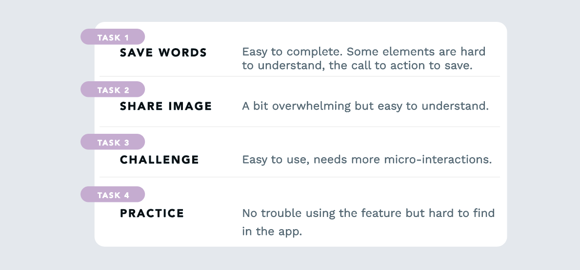 The users of my usability tests were able to give me great insights and feedback. This is the tasks and results: